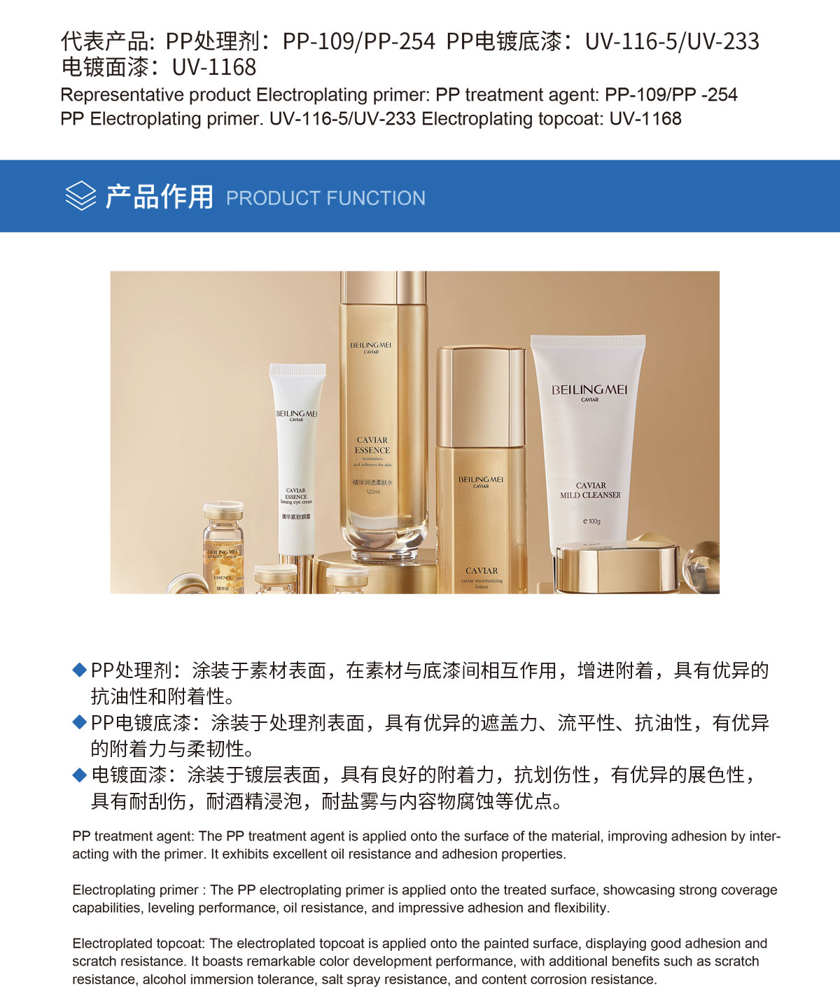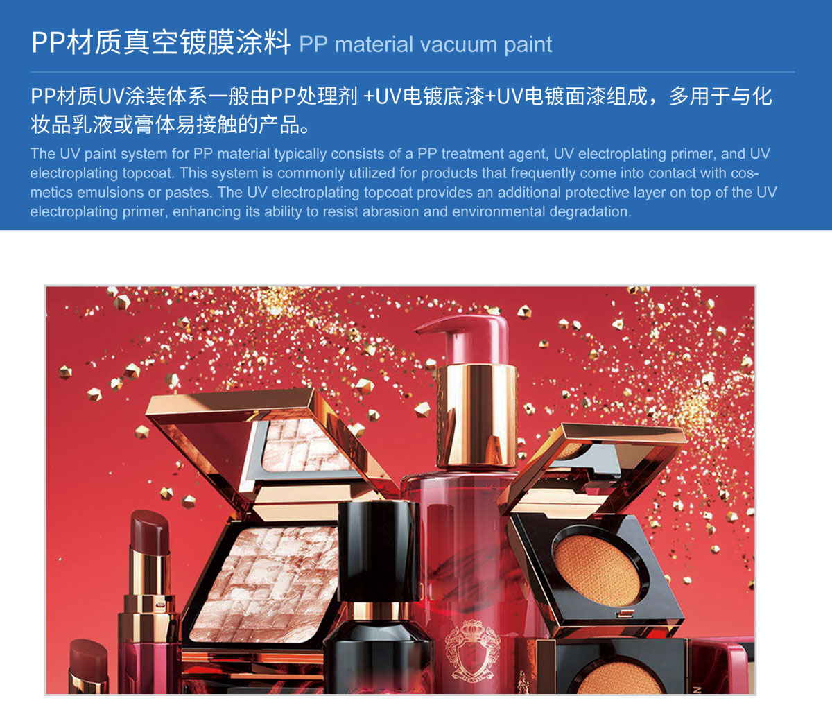 PP材质UV涂装体系一般由PP处理剂 +UV电镀底漆+UV电镀面漆组成,多用于与化妆品乳液或膏体易接触的产品